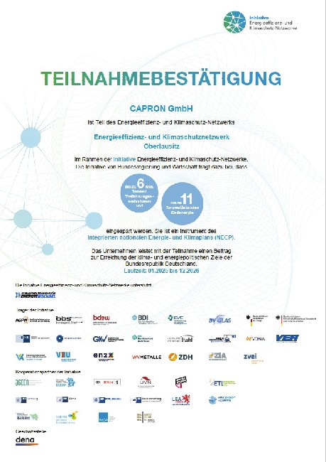 Seit Januar 2026 beteiligt sich CAPRON am Energieeffizienz- und Klimaschutznetzwerk Oberlausitz (EEKN-OL), um gemeinsam mit 14 regionalen Unternehmen den Energieverbrauch und den Ausstoß von Treibhausgasen systematisch zu reduzieren.